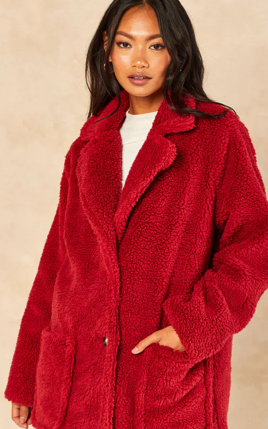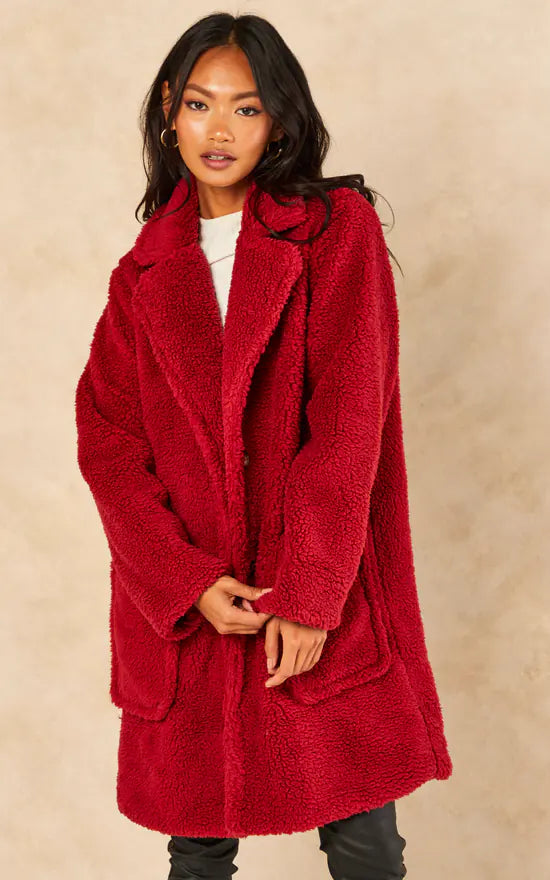 Burgundy Faux Fur Longline Teddy Overcoat