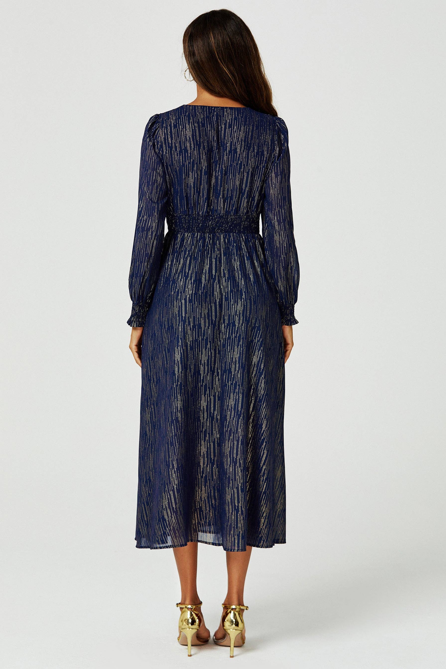 Gold Stripe Foil V-Neckline Long Sleeve Maxi Dress In Navy—a dazzling choice for making a statement at any special occasion. The dress features an elegant V-neckline that adds a touch of sophistication, while the gold stripe foil detailing brings a glamorous and eye-catching element. Crafted with attention to detail, this dress is perfect for those who want to make an unforgettable entrance.