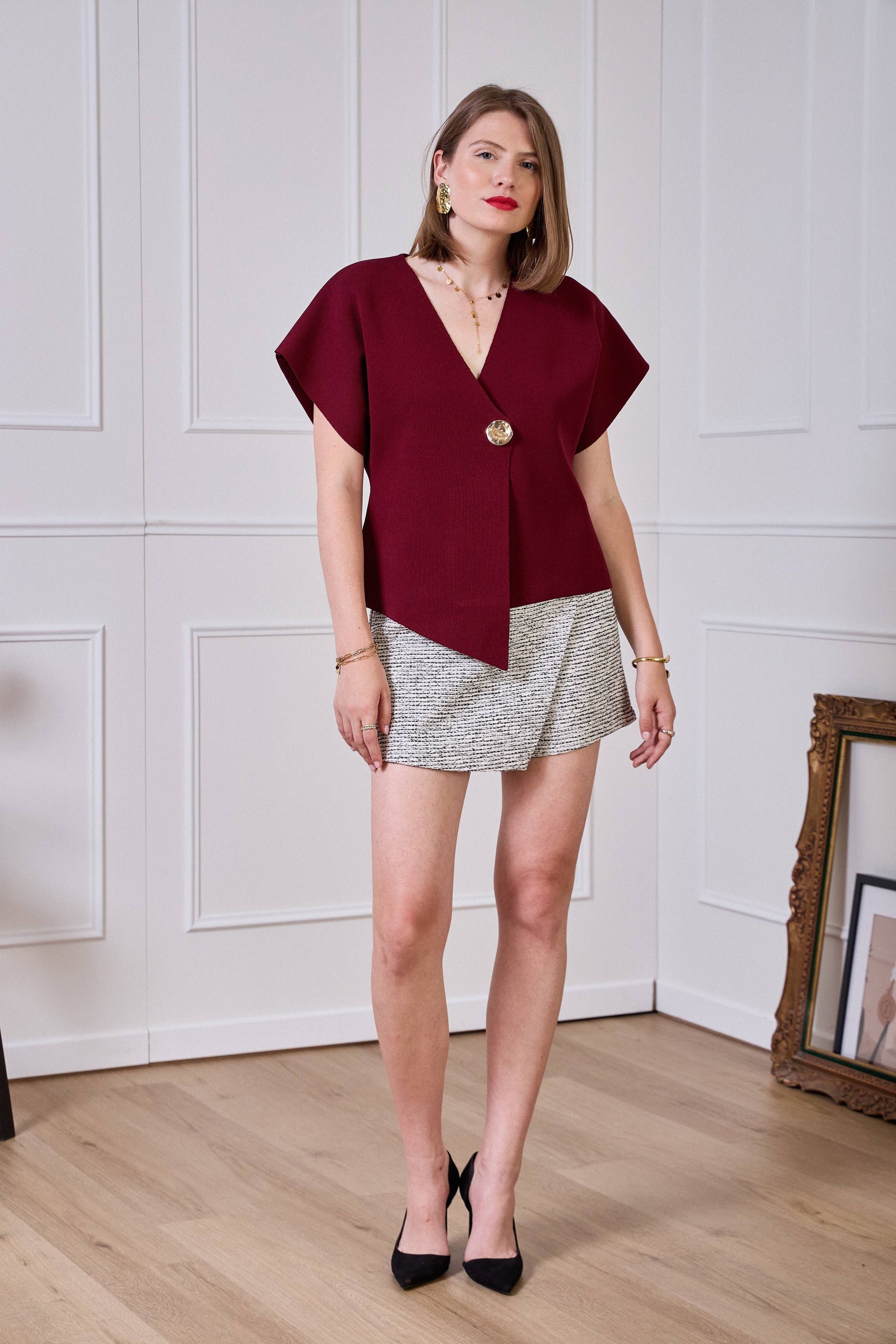 Bordeaux Knit Vest in wine with gold button detail. Short sleeves for that Summer - Autumn transition.