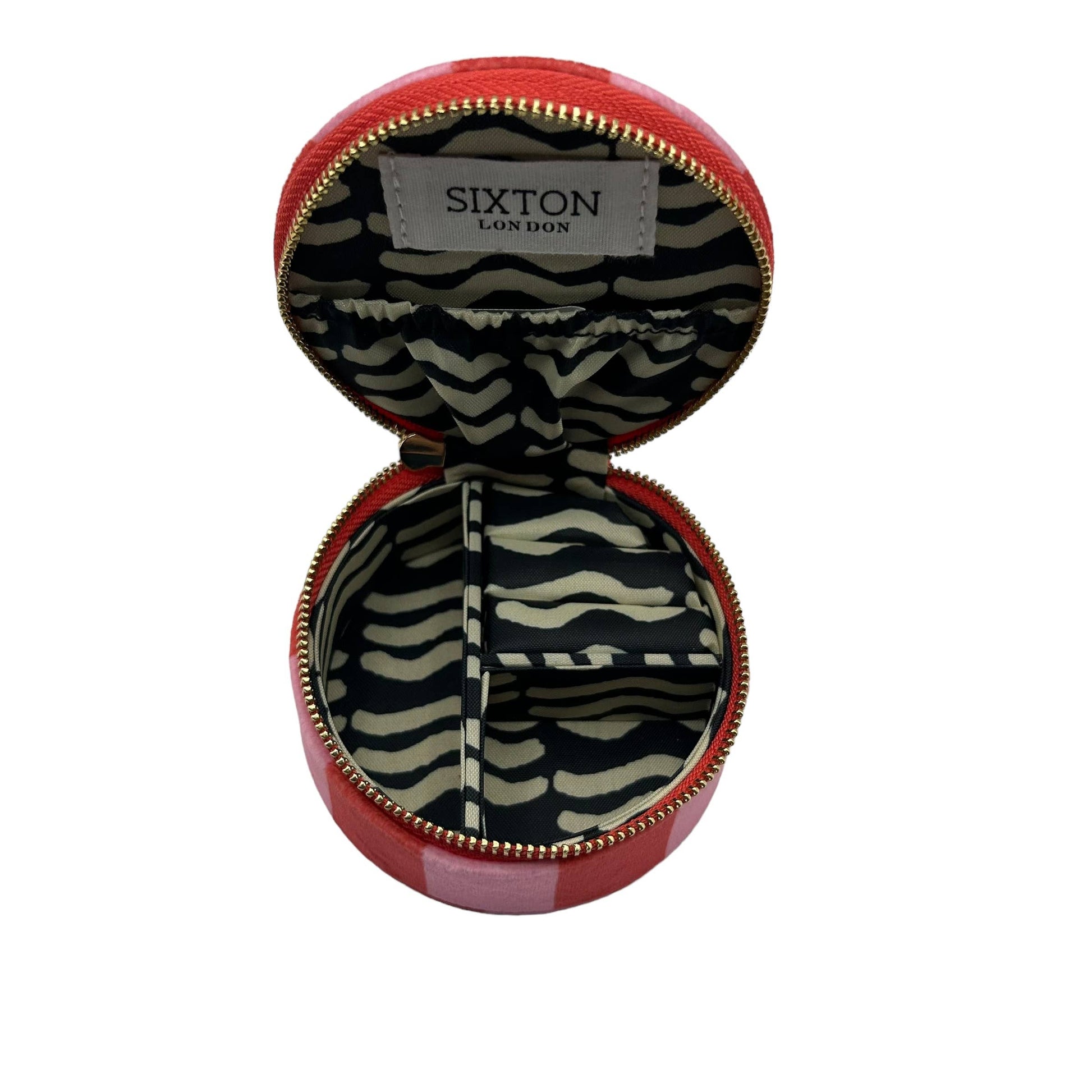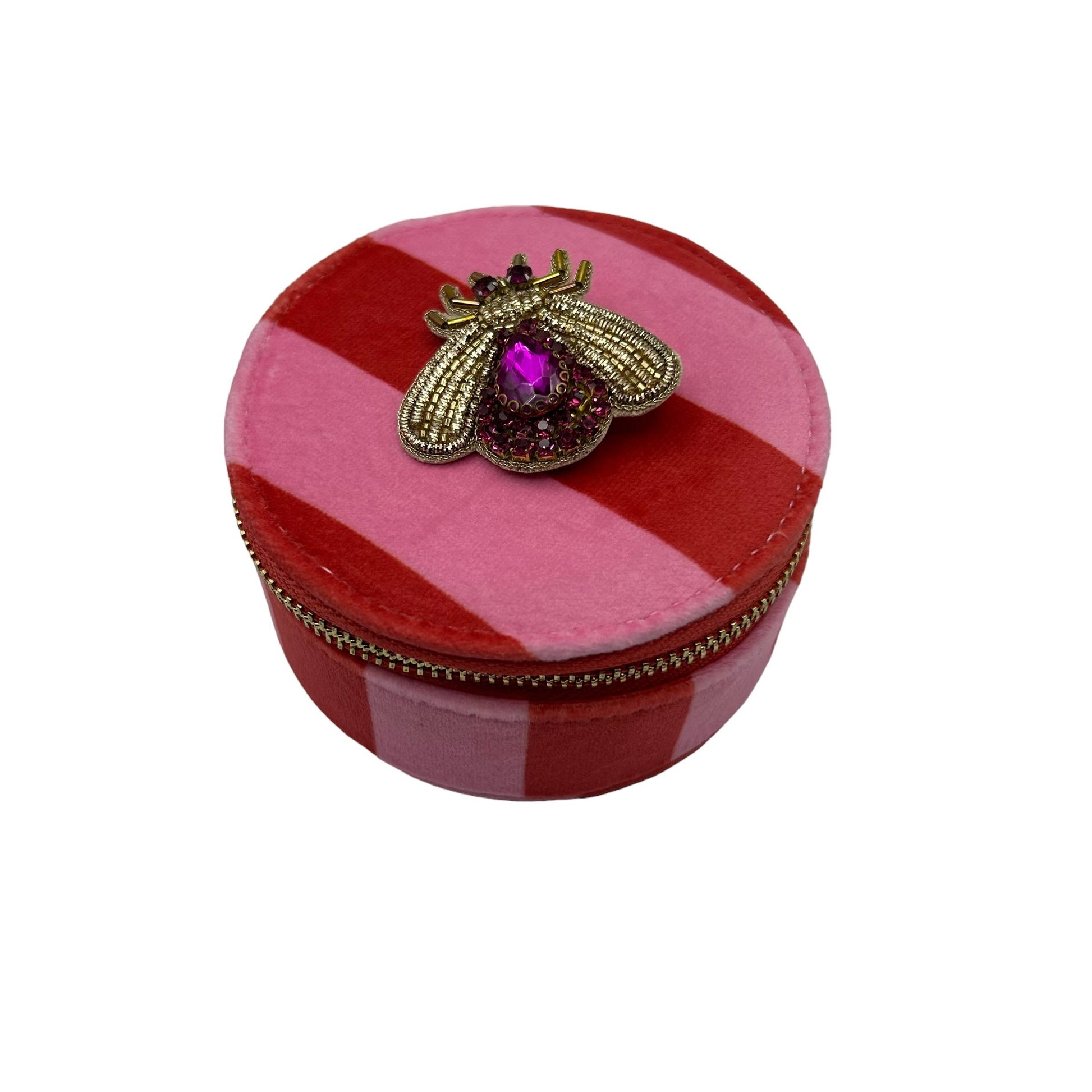 A jewellery travel pot, made from recycled materials, in a red and pink striped print with a detachable, jewelled insect brooch. With two sections for necklaces, a ring and earring holder and a pouch pocket. it's perfect for packing your jewellery for travel or to keep it at home. You can remove the pin to wear - two gifts in one!