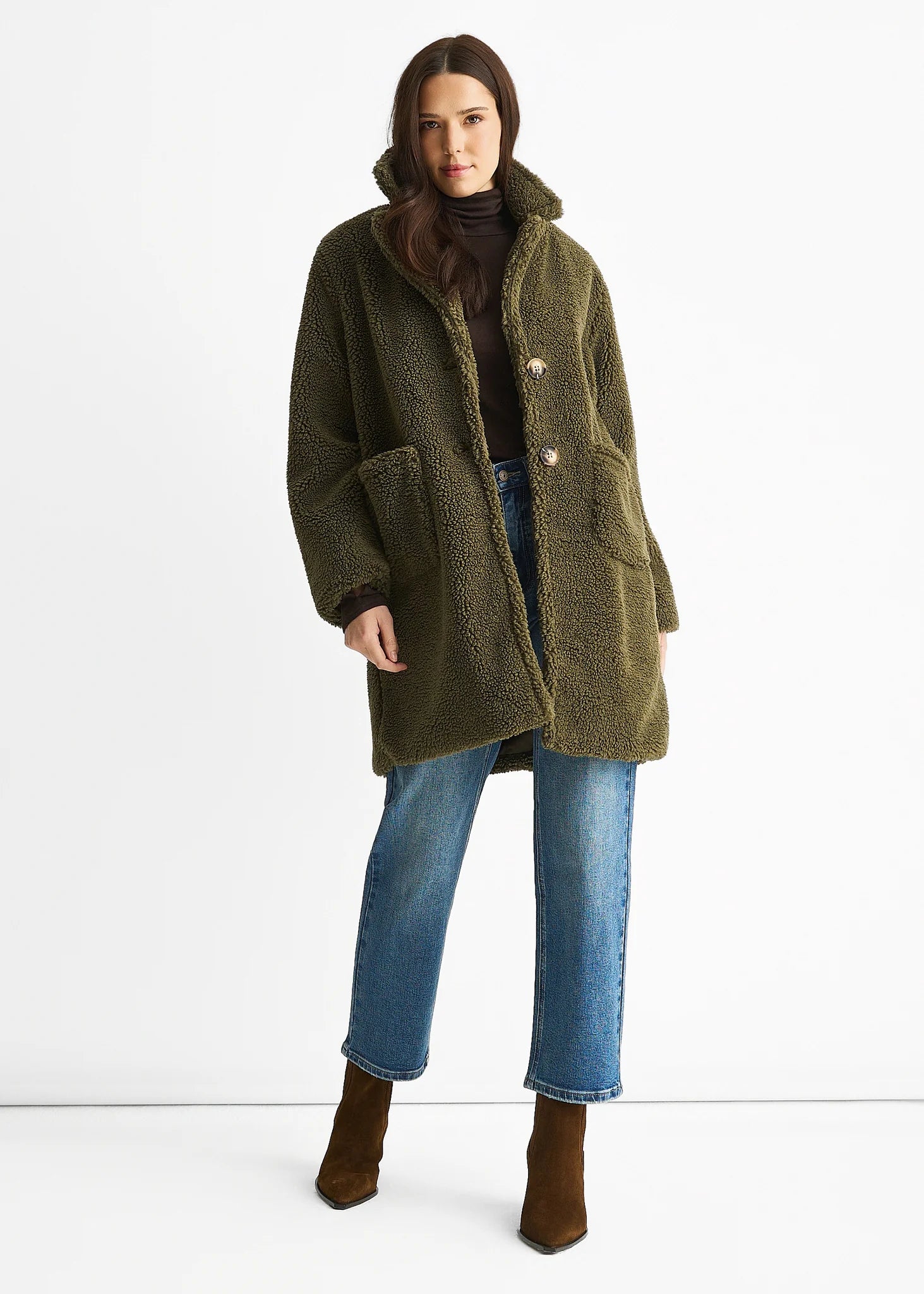 This Khaki Faux Fur Longline Teddy Overcoat will keep you cozy and fashionable all season long. The faux fur design and longline cut add style, while the teddy texture provides warmth and comfort.
