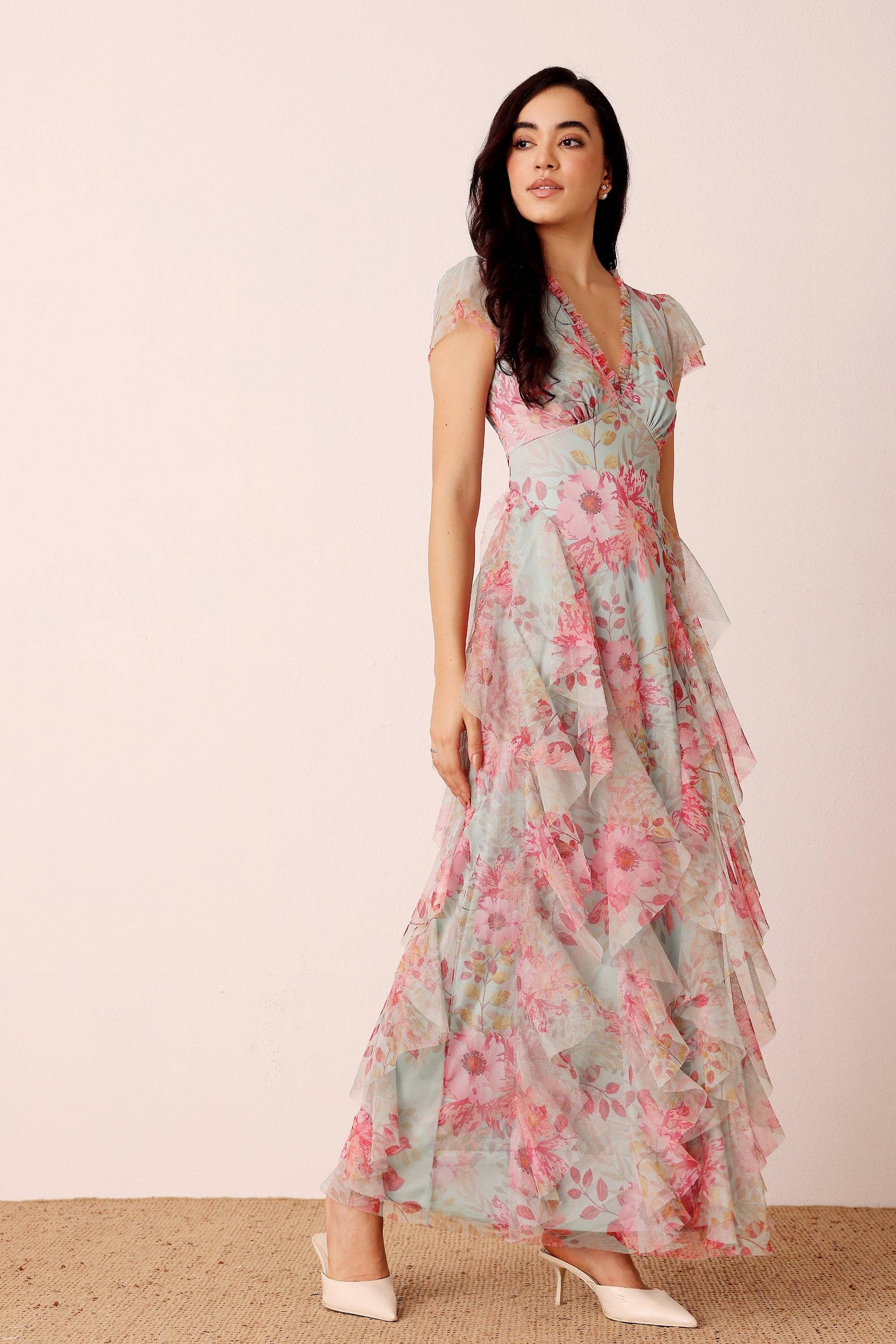 Lace & Beads Melody Maxi Dress in Mint Floral. Step into summer romance with the Melody Maxi Dress in Mint Floral, crafted from soft tulle that drapes beautifully with every movement. This floaty occasion dress features delicate ruffle tiers, a flattering V-neckline and soft cap sleeves, all adorned with a dreamy pink floral print set against a fresh mint base. Perfect for weddings, garden parties and special summer events, its lightweight, ethereal silhouette captures feminine elegance with ease.