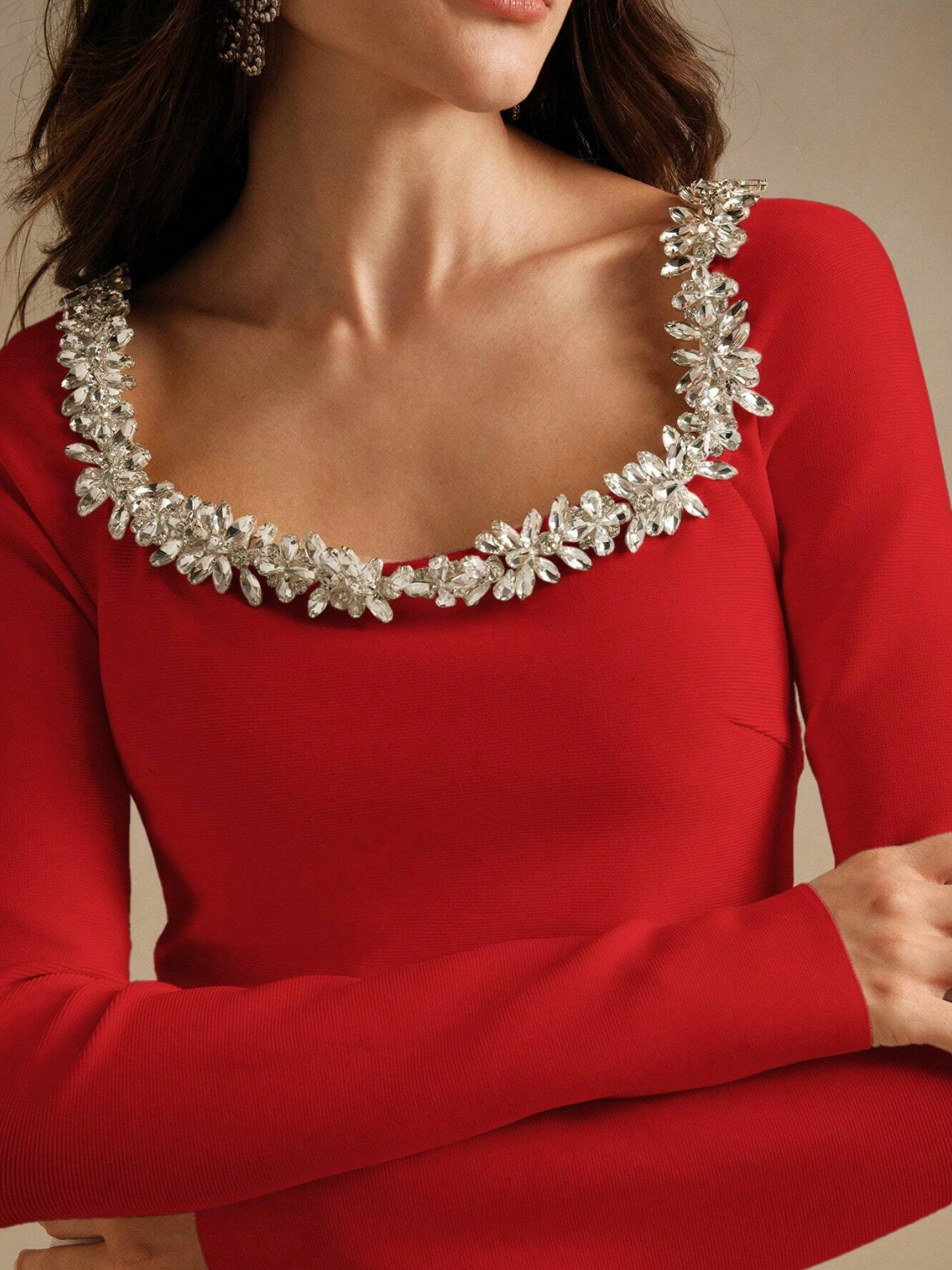 Midi Bodycon dress in Red with silver neckline embellishment. Great firm stretch fabric with back zip fastening