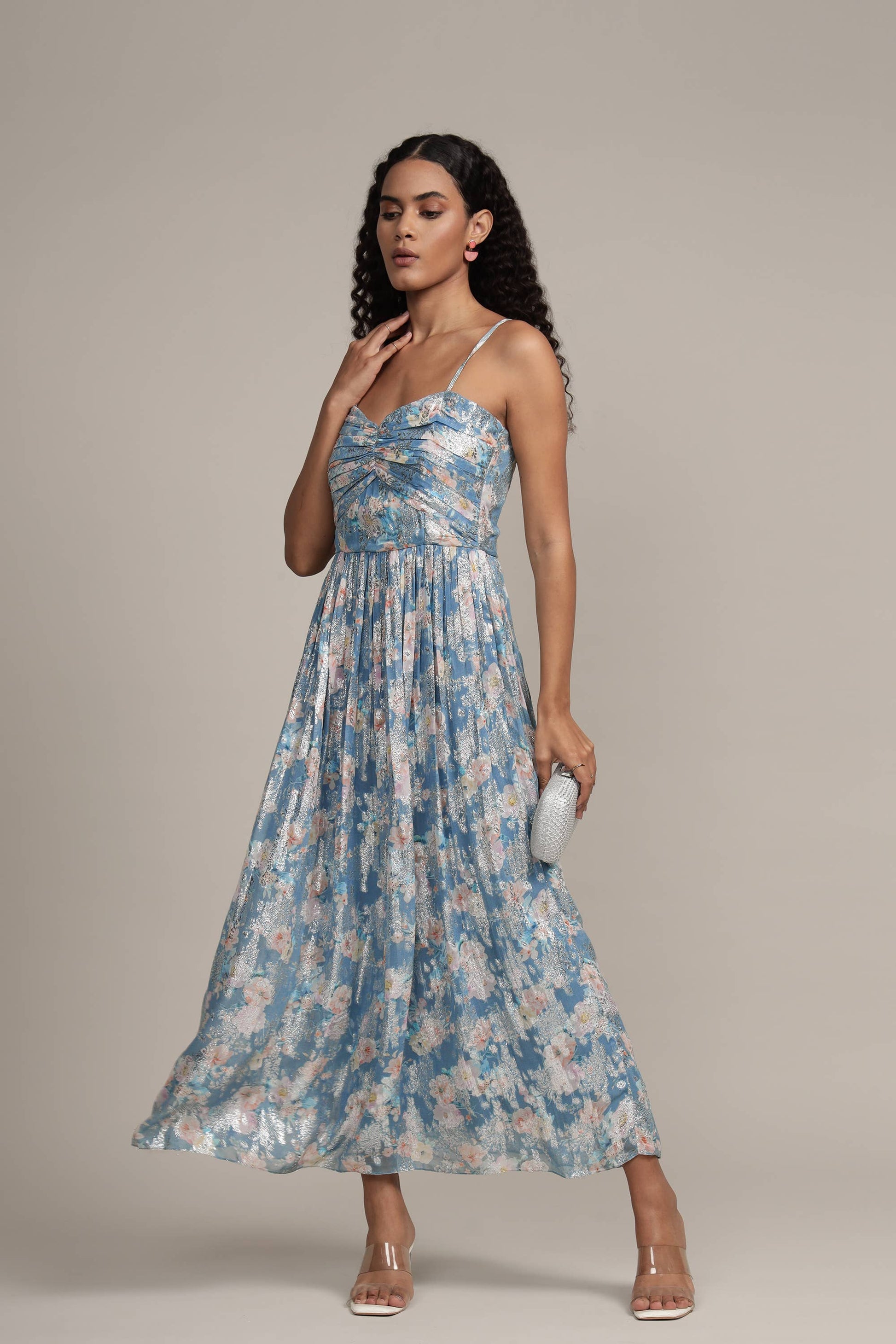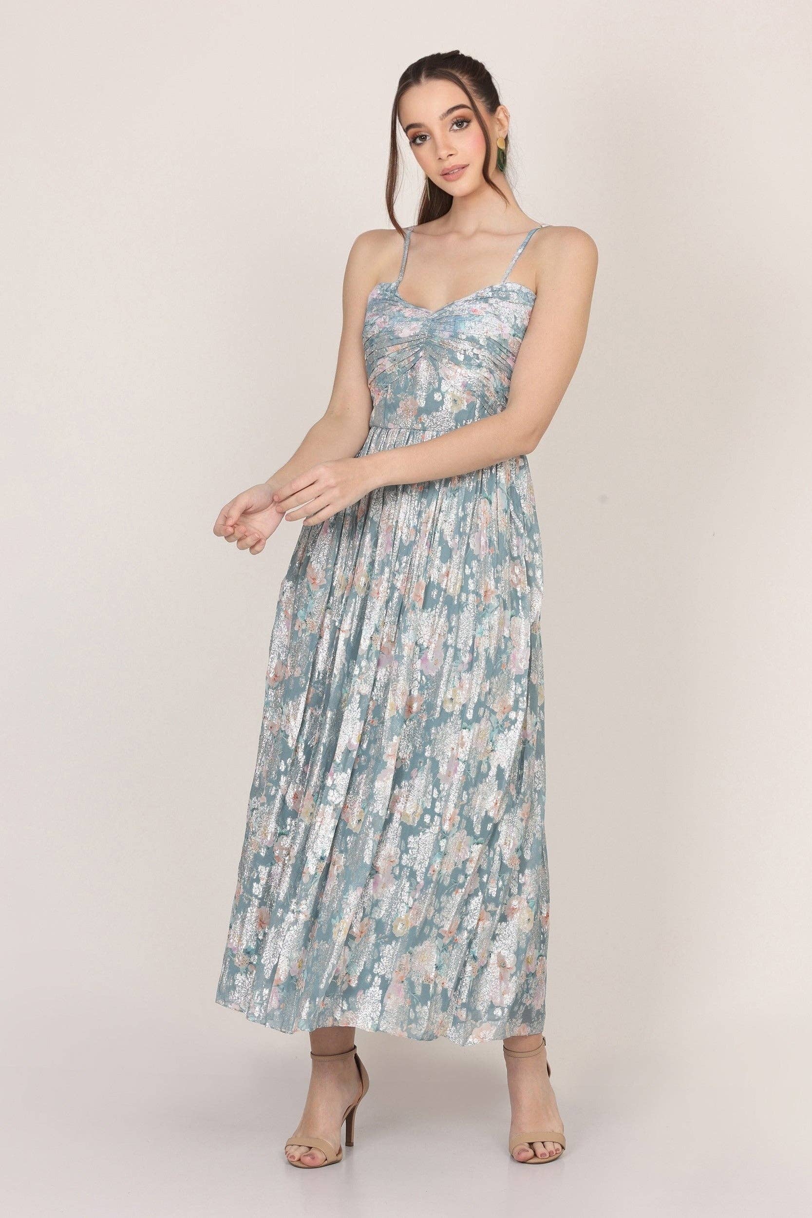 Lace & Beads Nelex blue floral dress. Playful metallic print shimmers throughout this beautiful floral print dress. This is the perfect summer occasion dress for all your upcoming events. The flowing skirt with a fitted bodice accentuates the waist of this floral dress. The light blue dress features a pretty floral print that are accentuated by metallic details.