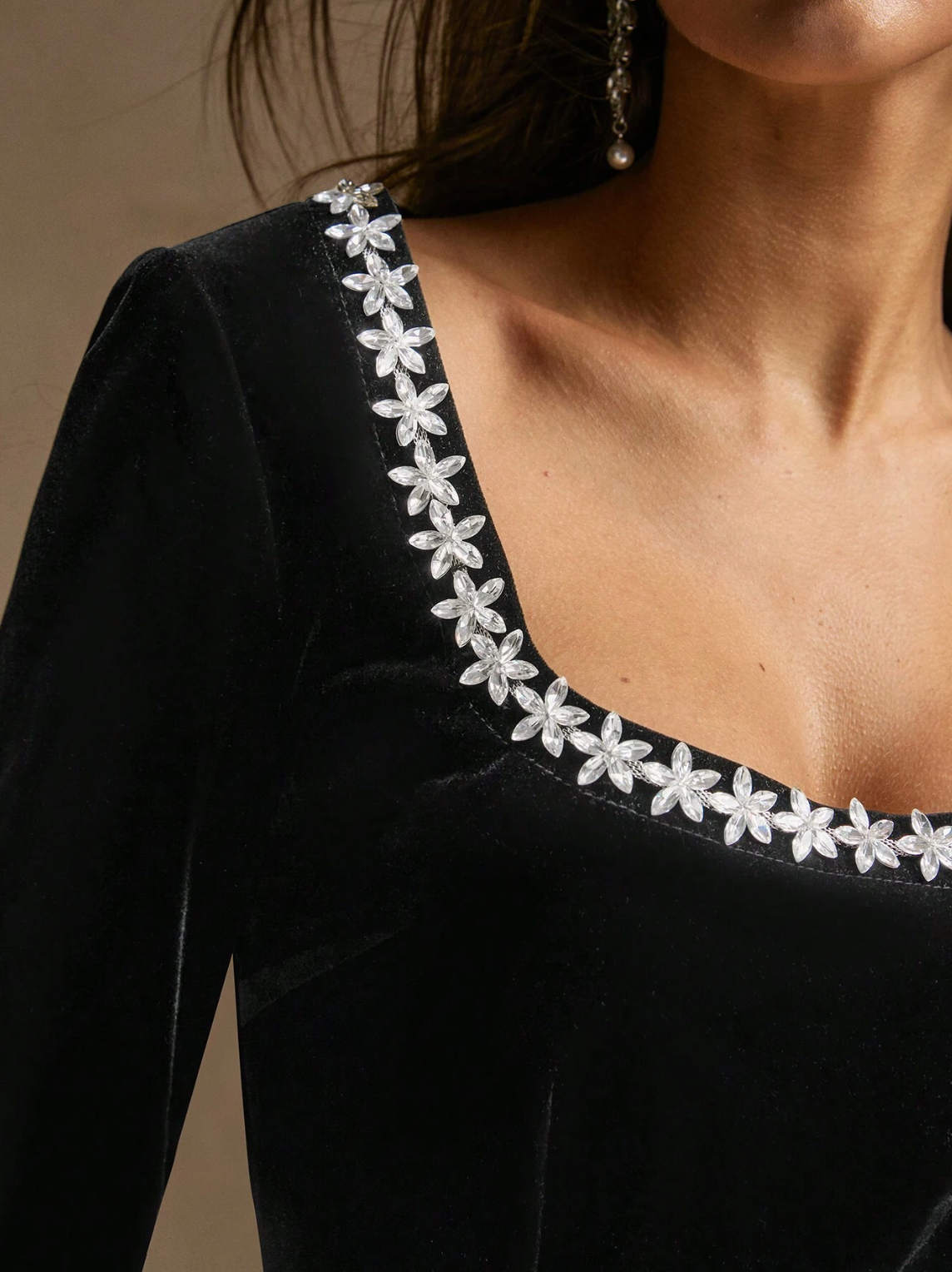 Velvet Mini dress in Black with silver neck embellishment.